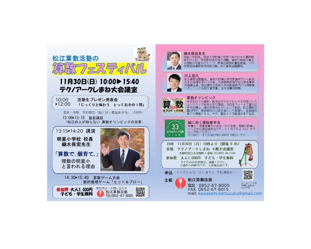 中学生以下の算数・数学好きな子どもたちを対象にしたコンテストで毎年6月に開催。1992年フィールズ賞の広中平祐博士、細水保宏先生らによって創設。松江算数活塾は昨年、島根県初の公認会場として実施し、全都道府県での開催となる。今年、塾生より決勝進出者が誕生。