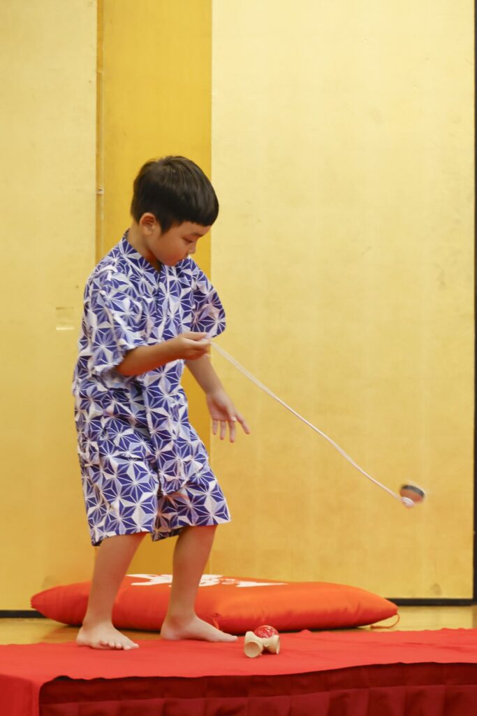 蝶々は、口上を「ちょうちょう」の歌で始めました。小咄も最後までゆっくりと大きな声で言い、たくさんの拍手が贈られました。こま剣は新たに独楽回しを披露、朔太郎は大好きなネタに張り切ってネタおろしとは思えないしゃべりっぷり。八三つ、いる歌、それぞれの得意ネタにも敬老会のみなさん大喜びでした。
