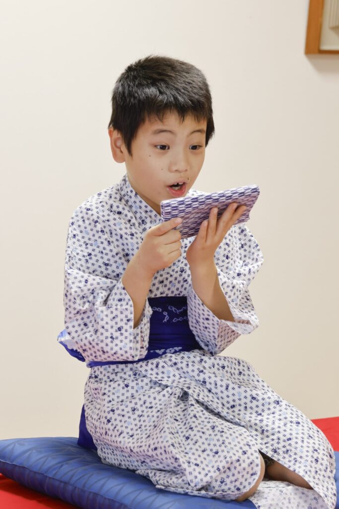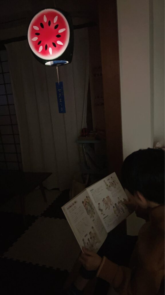 北町自治会の敬老会のお祝いに招かれました。寿々めの体操で体と心をほぐしてから、落語会に入りました。玉はがねはかっぱつりの舞台をそばを流れる赤川にして語りました。みんなの落語にお客様もたくさん笑ってくださいました。写真は、この日プレゼントされた手作りの提灯。夏祭りの名物なのだとか。一つ一つていねいに作られており子どもたちも感心して眺めています。その日の夜、さっそく明かりを灯して、読書に親しむ小竜の写真が届きました。灯火親しむ候、という言葉がぴったりのすてきな贈り物でした。他にも手編みのマフラーやお菓子に図書カードなど品々にもらって、子どもたちはずっとご機嫌でした。(写真は保護者)