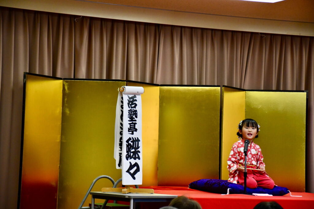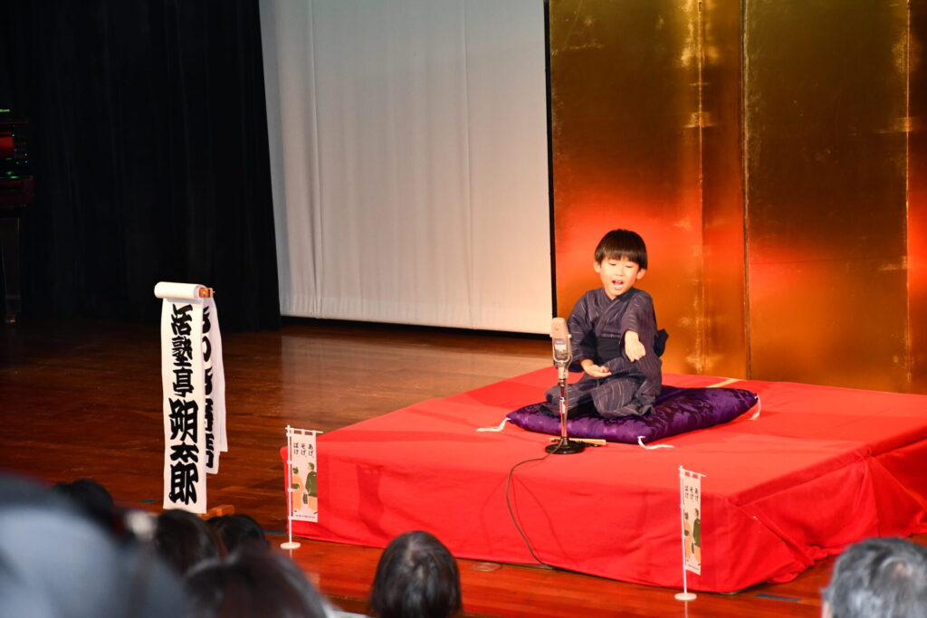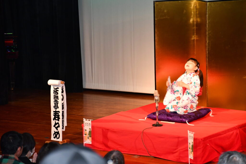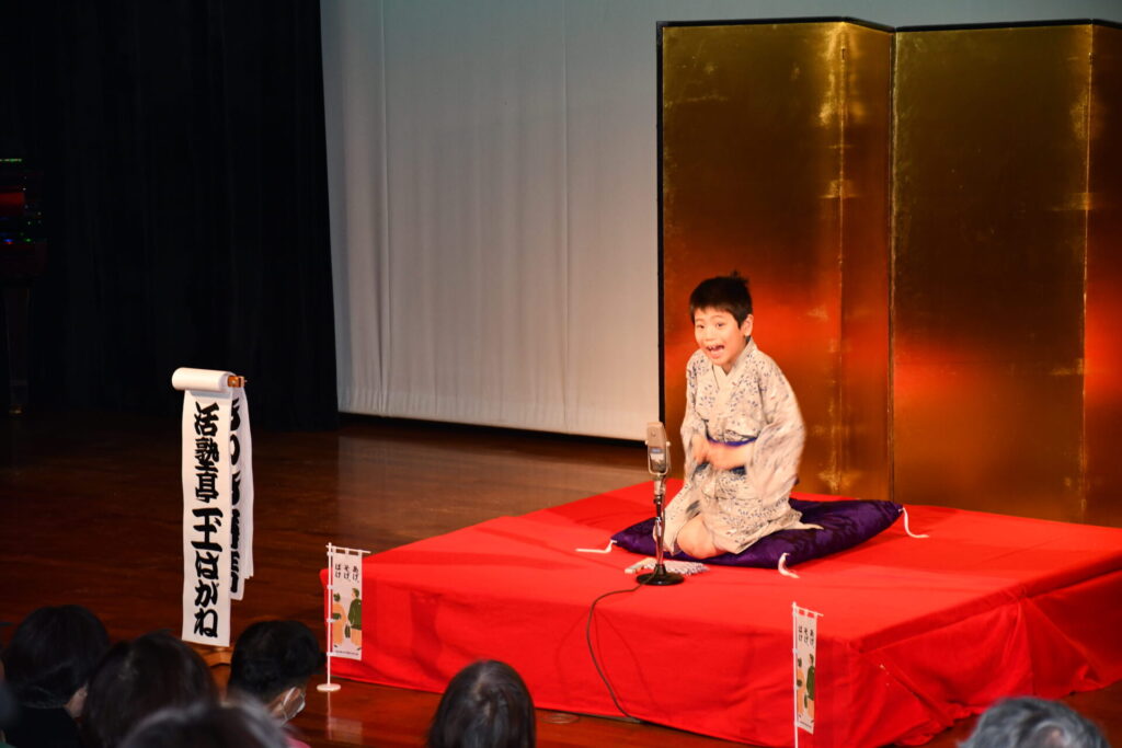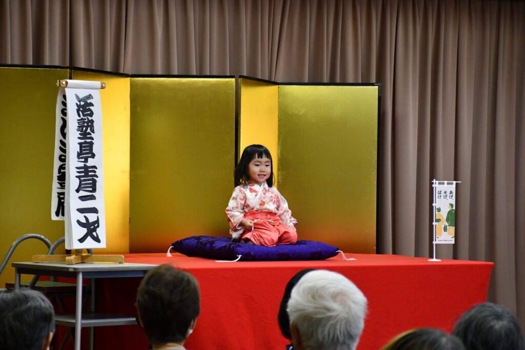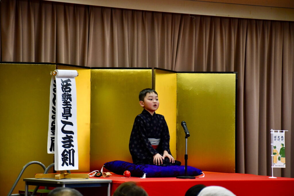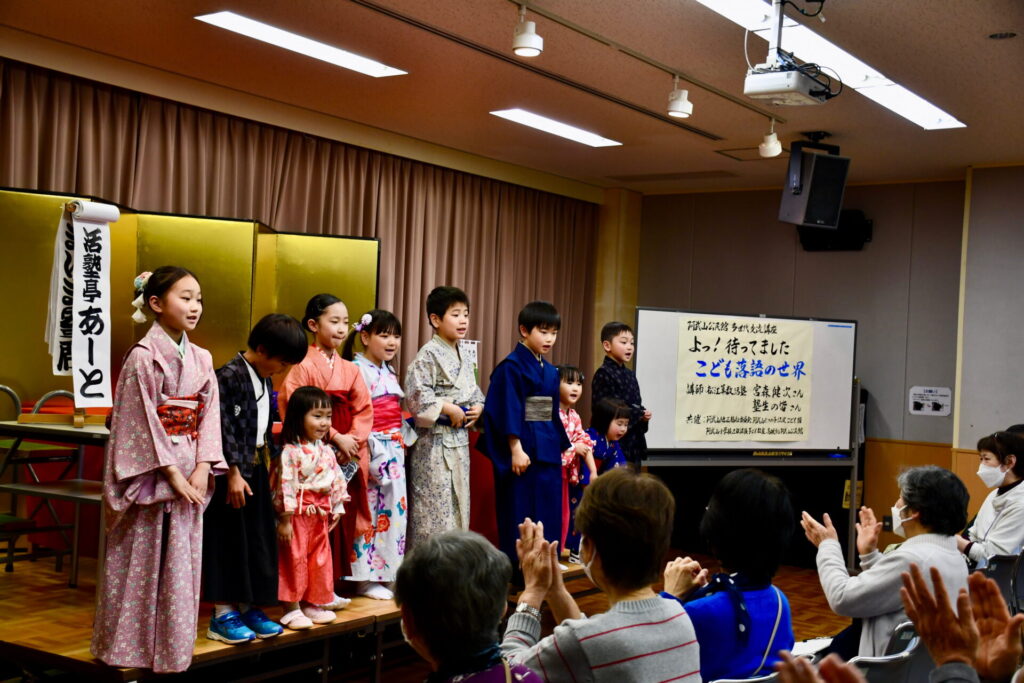 会場の八束公民館多目的室はびっしりのお客様でうまり、リハーサルのときからさかんに拍手がわいて大いに盛り上がりました。欠席の子もあって急遽演目を増やした子もいますが、お客様に乗せられていつも以上に気持ちを込めたり、滑らかだったり、自信を持って演じることができました。朔太郎の「かっぱつり」には歌が出ますが、会場のみなさんがいっしょに歌ってくださって、朔太郎も張り切ってたくさん歌いました。
