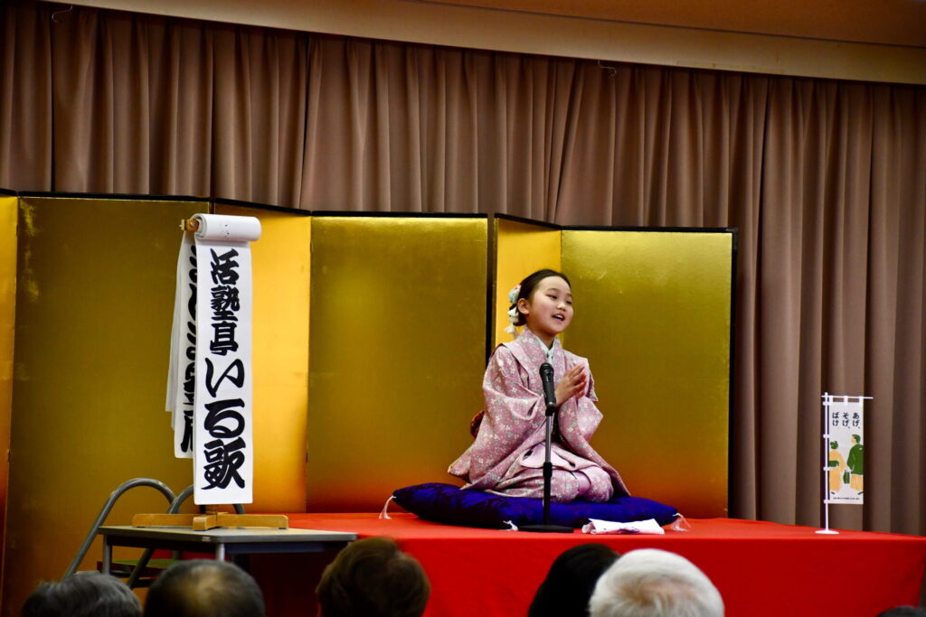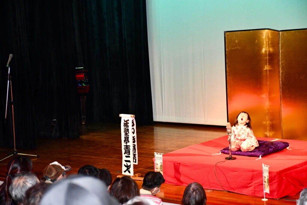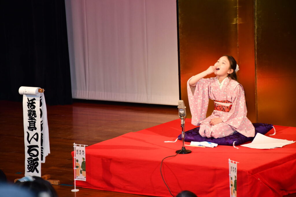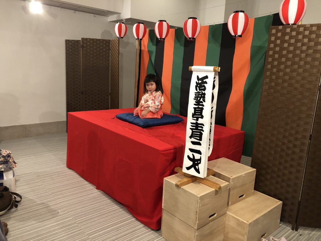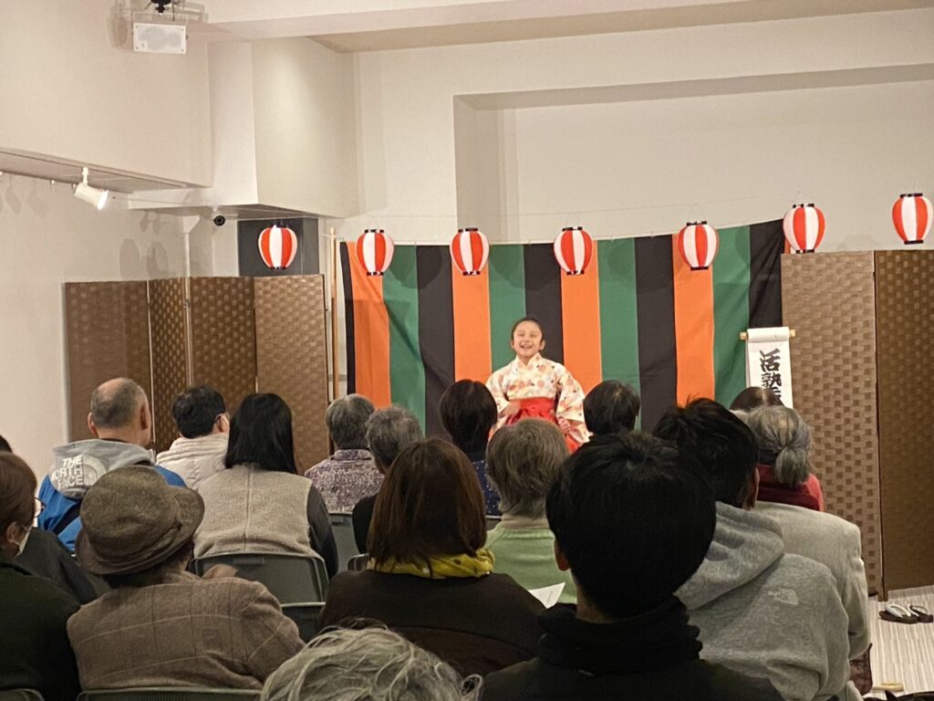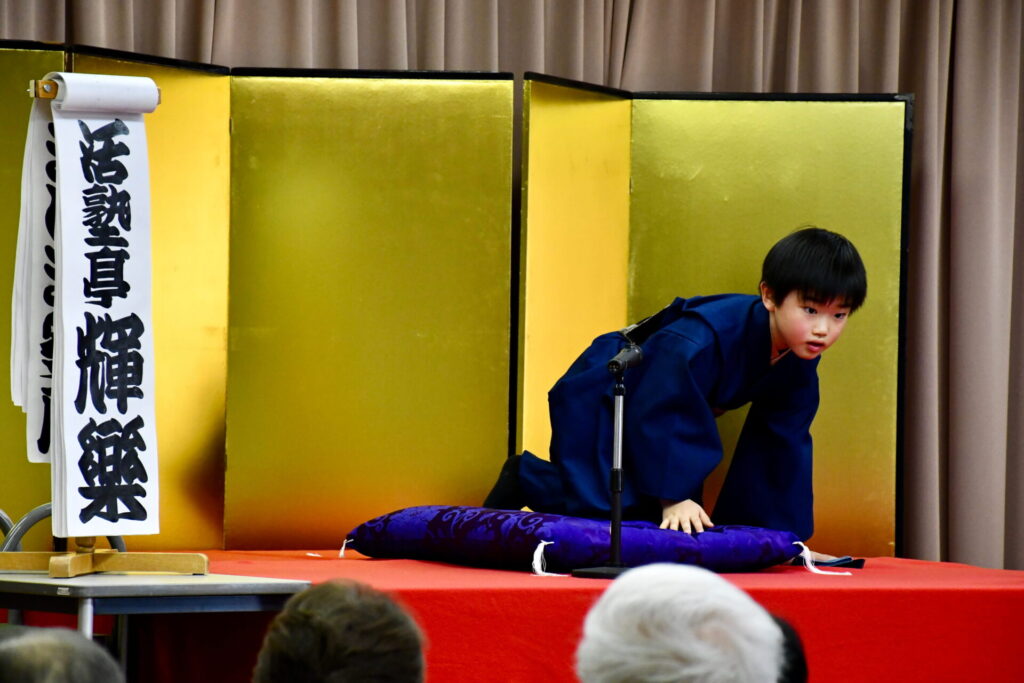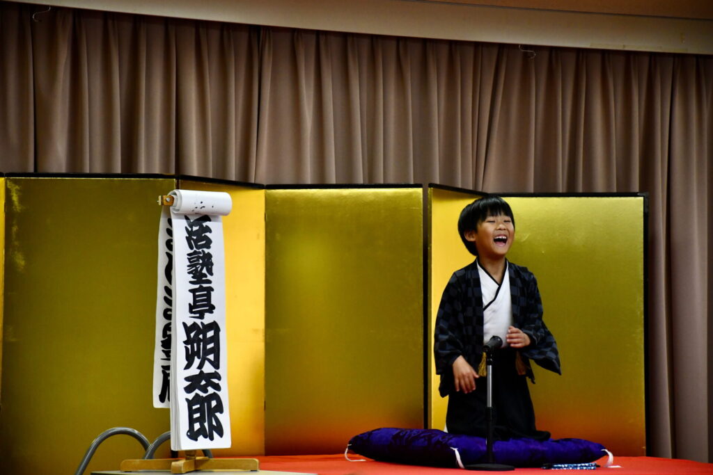 会場の八束公民館多目的室はびっしりのお客様でうまり、リハーサルのときからさかんに拍手がわいて大いに盛り上がりました。欠席の子もあって急遽演目を増やした子もいますが、お客様に乗せられていつも以上に気持ちを込めたり、滑らかだったり、自信を持って演じることができました。朔太郎の「かっぱつり」には歌が出ますが、会場のみなさんがいっしょに歌ってくださって、朔太郎も張り切ってたくさん歌いました。