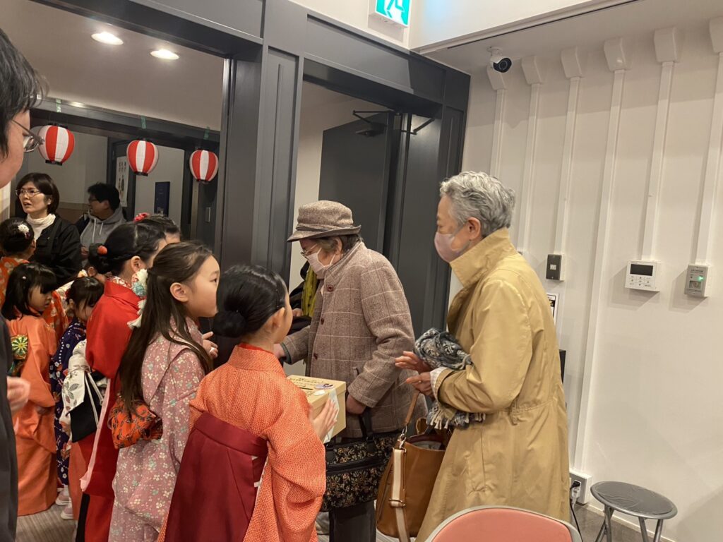 大荒れの天気で翌8日に予定されていた東奥谷は中止になりました。その前日である意味天気に恵まれました。三度目の咲花は、変わらず利用者や職員のみなさんに温かく歓迎してもらいました。寄席の後は、一人一人と握手をして回りました。耳の聞こえにくい方もおられ、落語は十分に楽しんでもらえなかった人たちも、握手会は満面の笑みで、会場の雰囲気もぐんと明るく盛り上がりました。これもこども落語の大切な役割の一つかと思います。