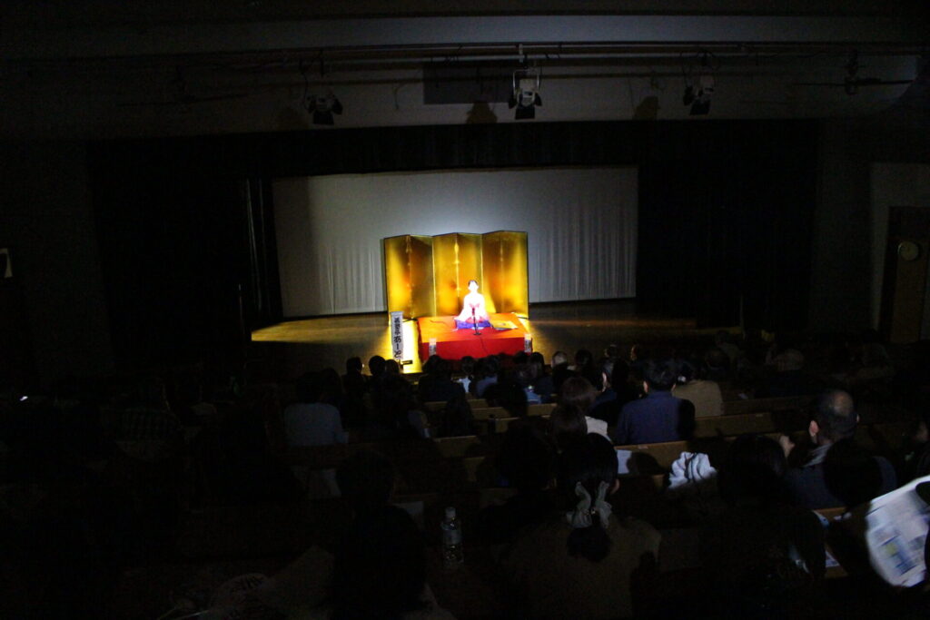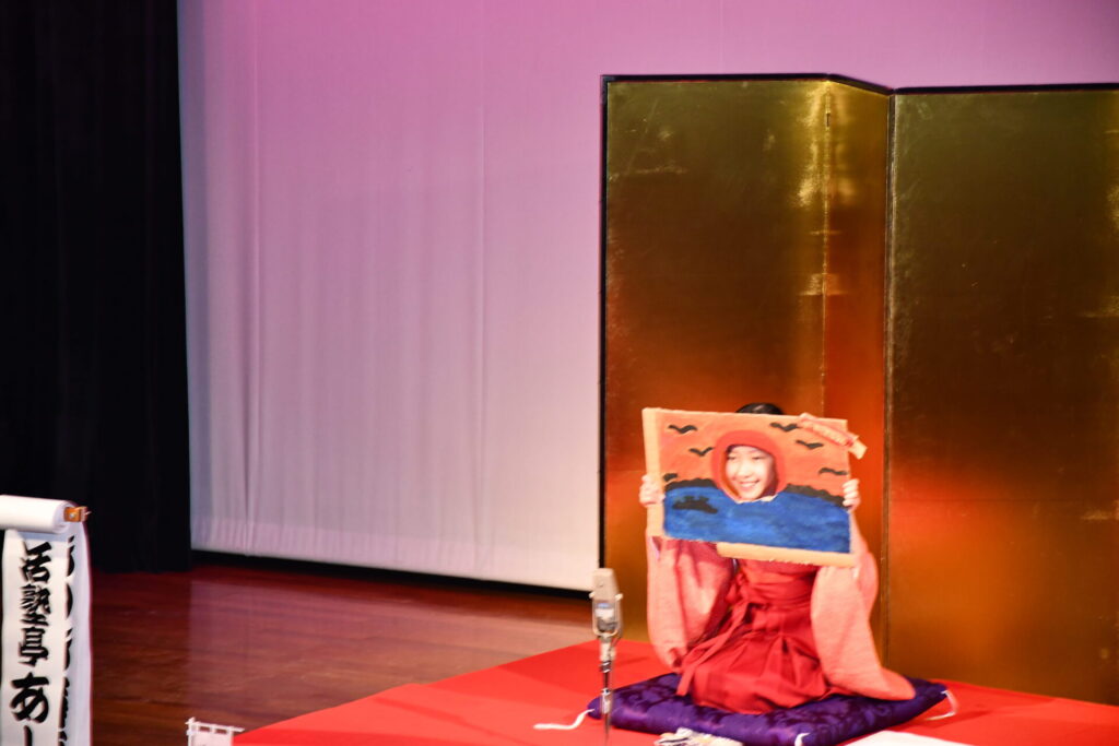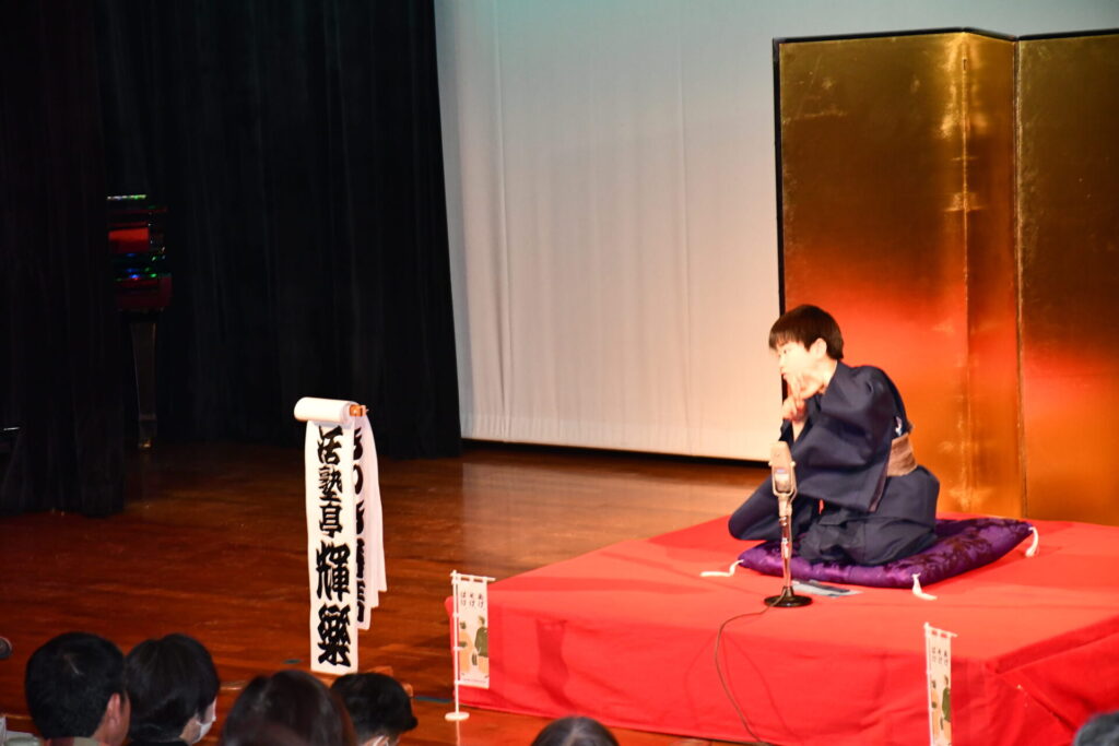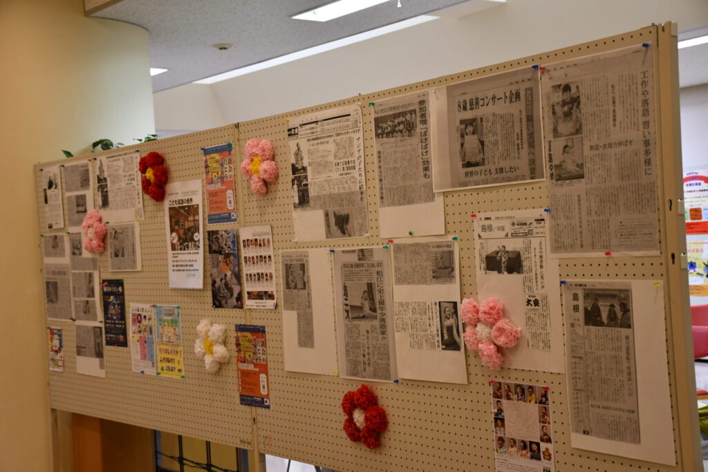 県外初公演は、大阪の高槻市における2公演となりました。阿武山公民館のホール前には落語教室の新聞記事が多数掲示され、高座の後ろには金屏風、曽我部館長や職員、阿武山地区の皆さんの手ですてきな会場が準備されていました。こどもたちも大いに気合いが入り、「おもしろかった」「驚いた」「感激した」などたくさんの言葉をかけられました。松江市の協力も得て、松江旅のパンフレットを配布し、松江をしっかりと宣伝しました。