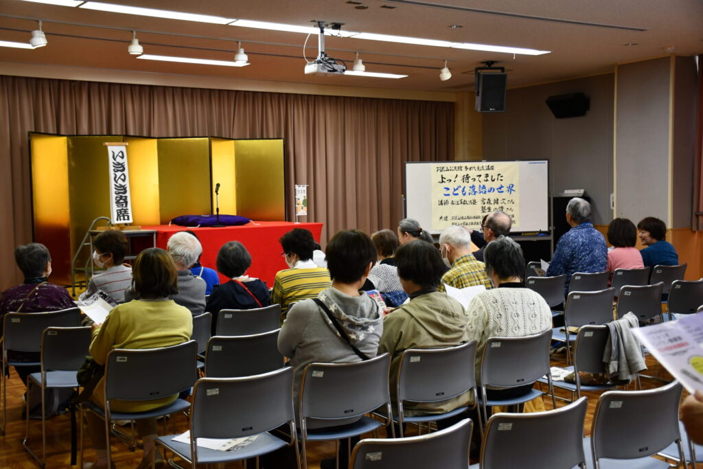 持田公民館の近くにある東持田集会所でのこども寄席。持田地区は集会所単位でよく声をかけてもらっています。みなさんで盛り上げてもらえるのでどこの会場も終始和やかなムードで楽しくできます。終演後は茶話会でみなさんから質問を受けました。子どもたちの回答に感心したり笑ったり、拍手が起こったり、いっしょに楽しいひとときを過ごしました。